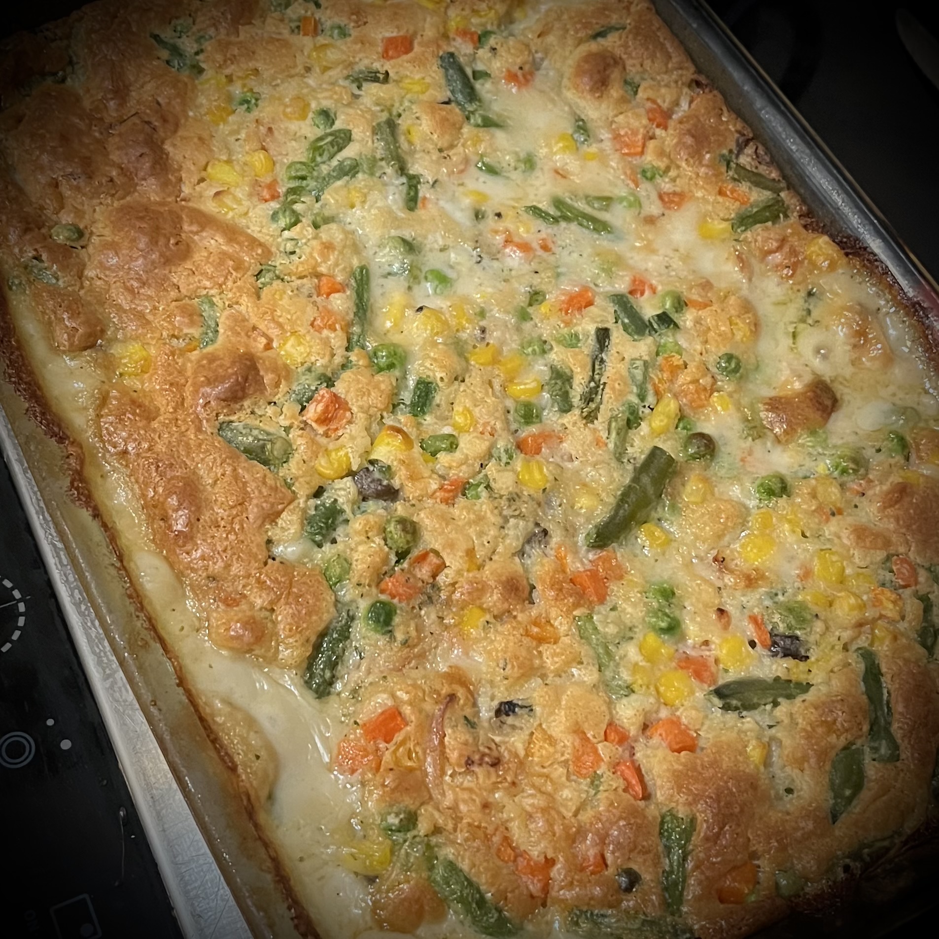 This is an amaing comfort food nice chicken. And veggies with nice breading for a great chicken cobbler