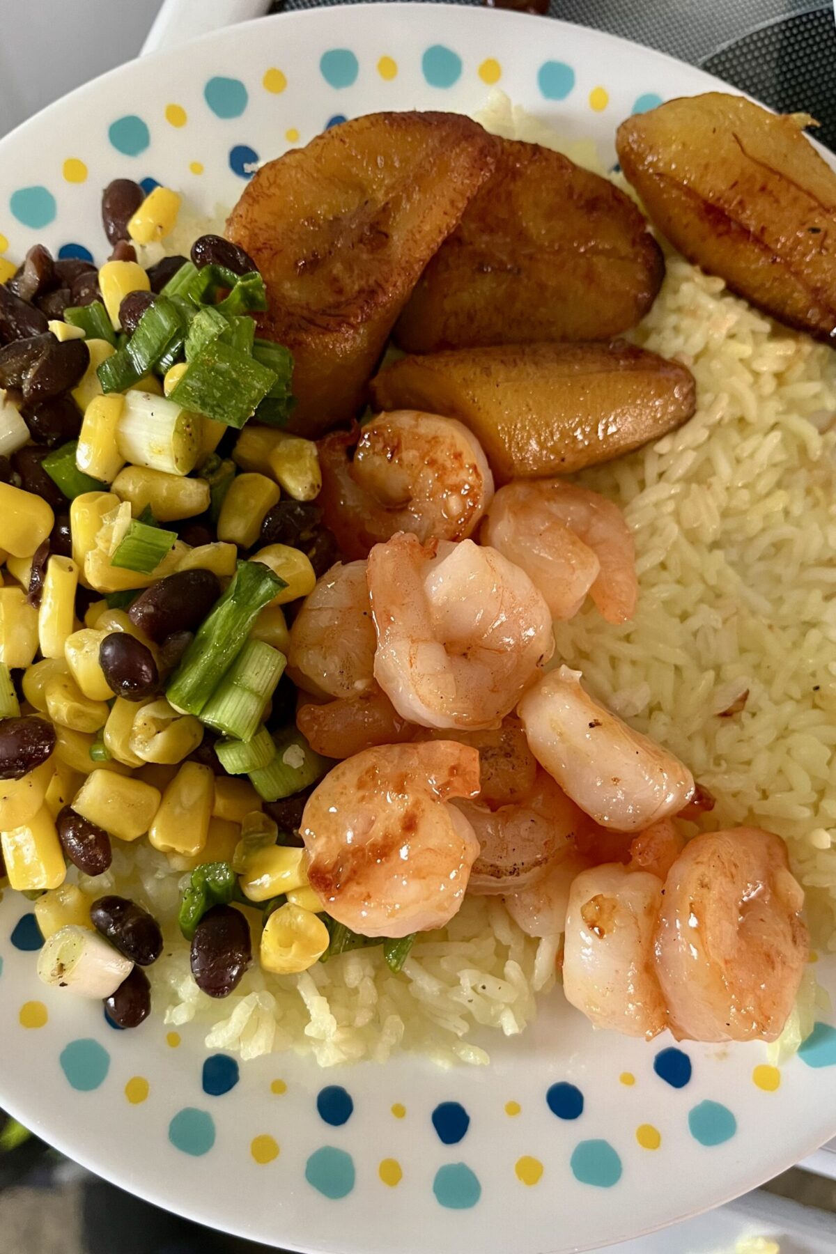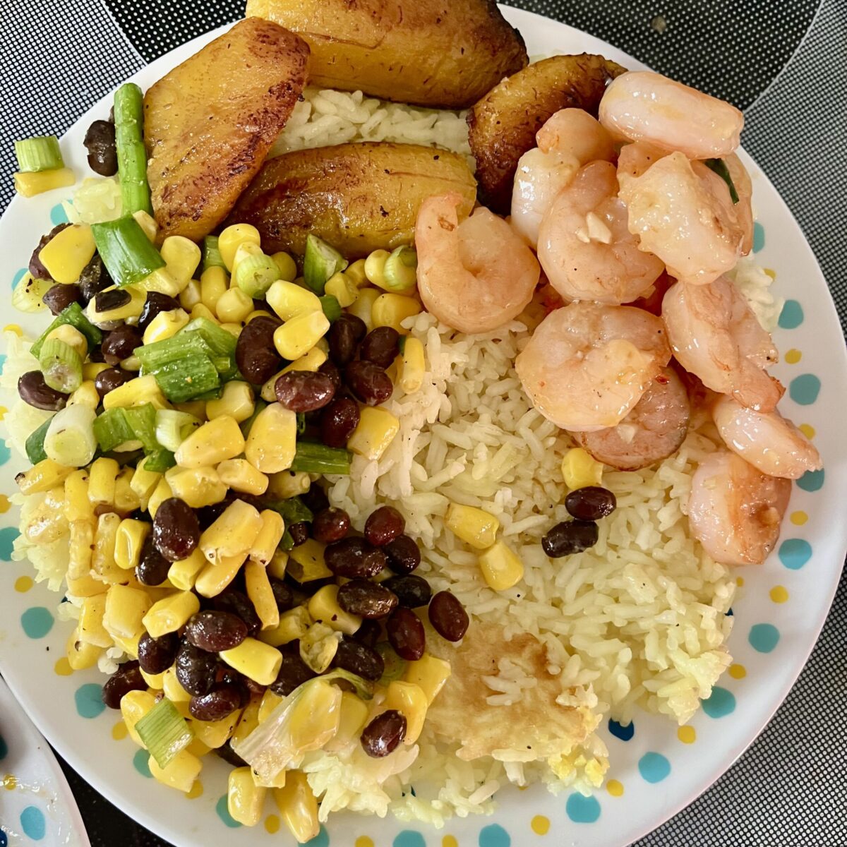 This is amazing rice bowl with shrimp with a corn and bean salsa with some plantains that have a nice flavor combination that I’ll come together for garlic shrimp rice